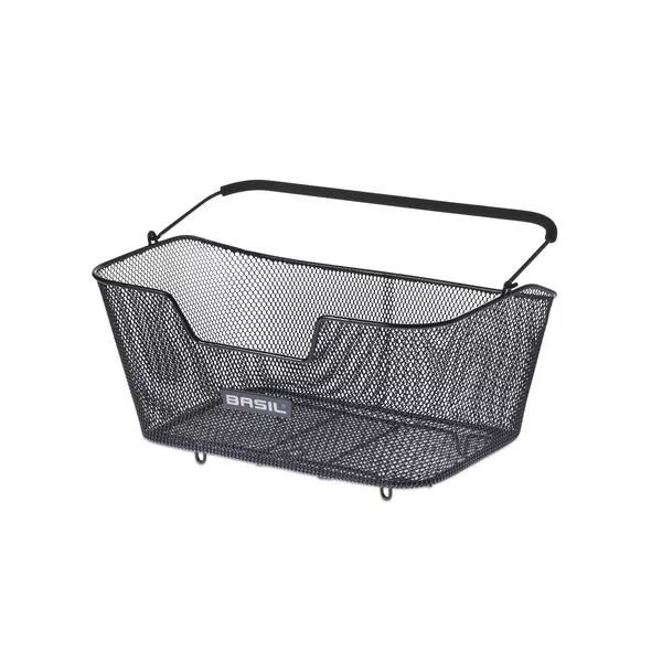 BASIL BASE L, hátsó kerékpáros kosár, nagy, sűrű szövésű, levehető, kényelmes Soft Grip fogantyúval, védőlábakkal, csomagtartó rugóhoz kivágva, a kosár alján található kampó segítségével rögzíthető a csomagtartó rugóvalkeresztben rögzíthető a csomagtartóra, lopás elleni zárhoz kivágva (ZÁR NEM TARTOZÉK), fekete