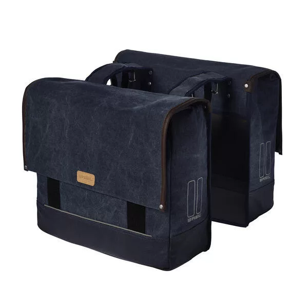 BASIL URBAN FOLD-DOUBLE BAG, dupla kerékpáros táska, vízálló újrahasznosított vászon, vízálló esővédővel, béléssel, tépőzárral záródik, két pánttal LEDhez/hevederhez/gyereküléshez/rugós csomagtartóhoz, dupla fényvisszaverővel, 42L (összecsukva) - 55L (kinyitva), sötét farmerkék